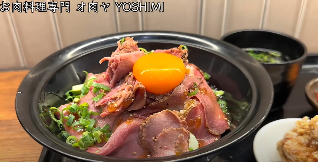 (おにくりょうりせんもん おにくや よしみ) : 고기 요리- 메뉴: 구운 쇠고기 덮밥 (튀김 김치, 생달걀 포함)